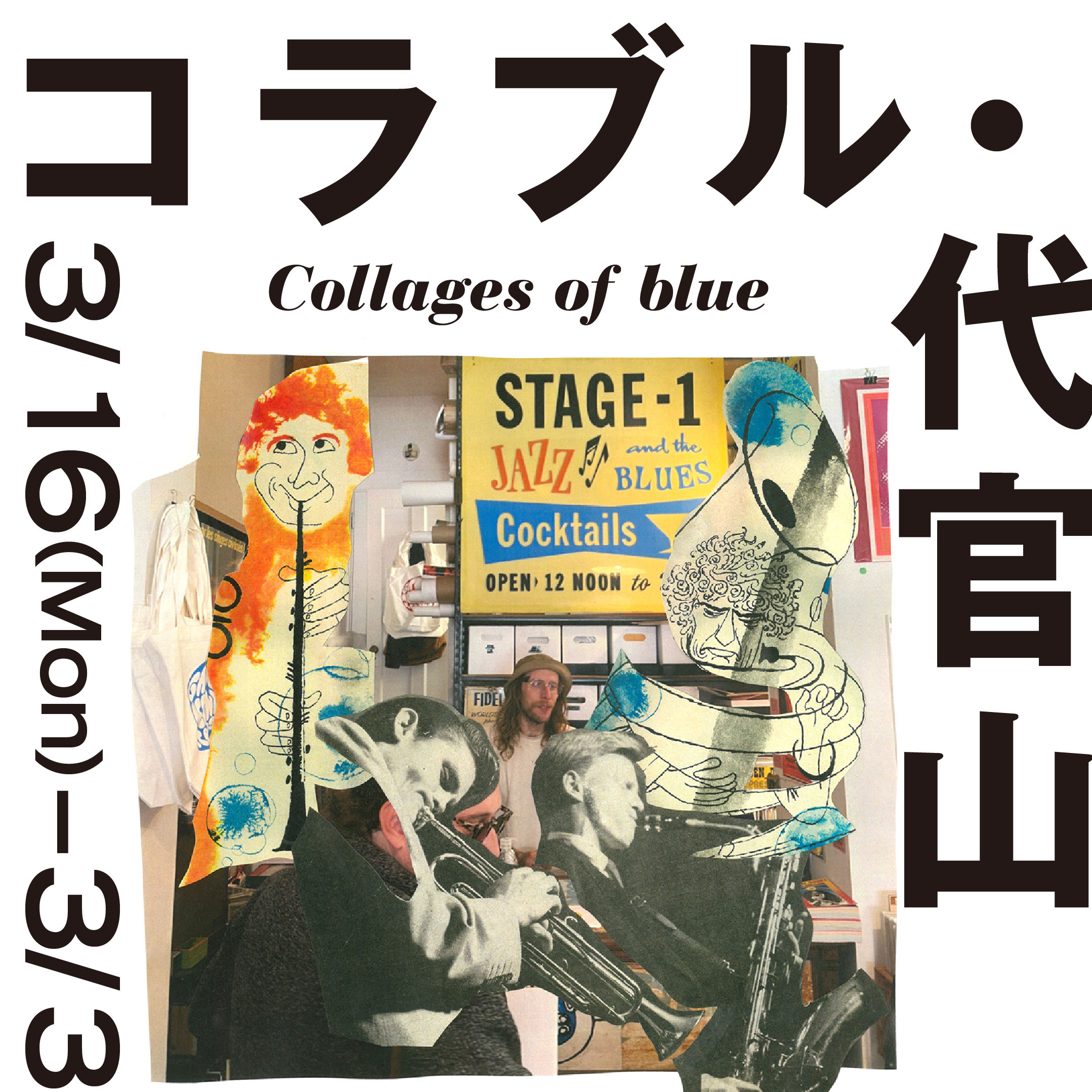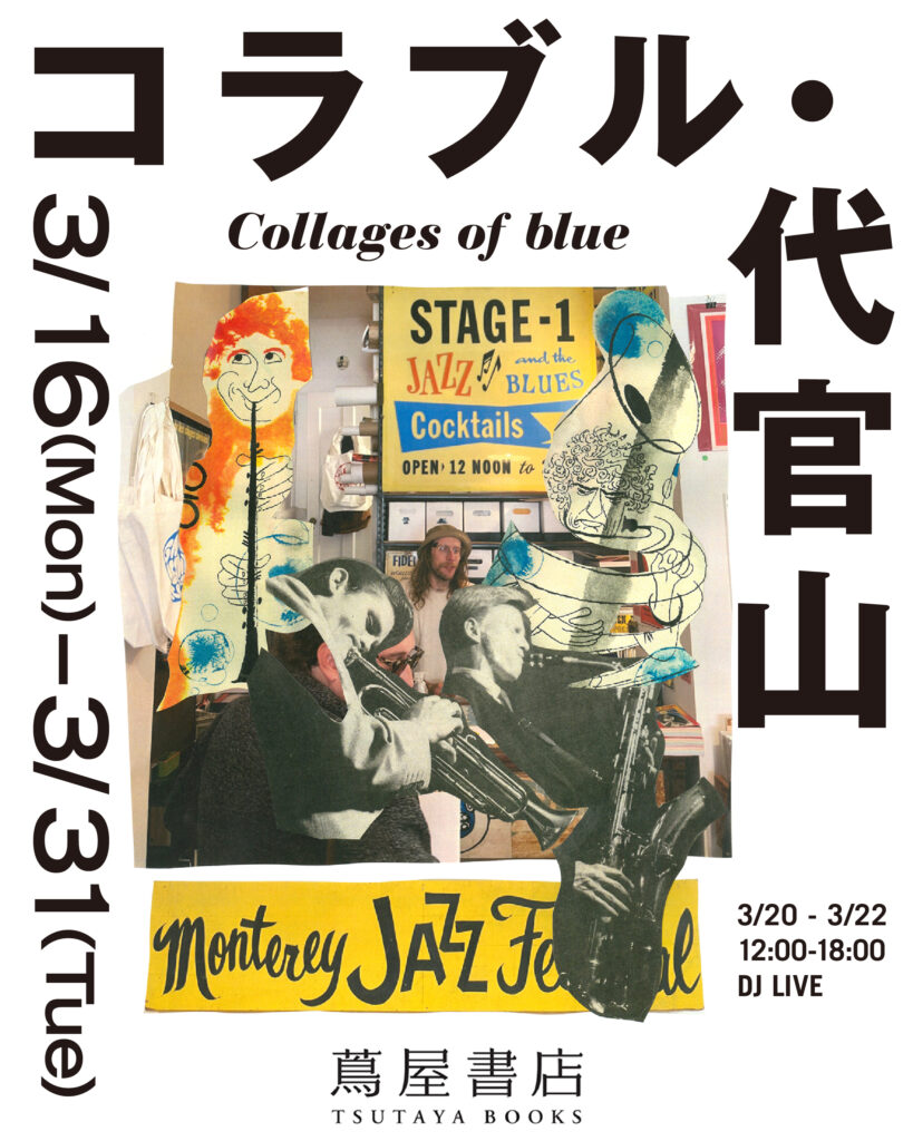 京都、銀座と蔦屋書店で続いたこのポップアップ展では書籍2タイトルはもちろん、『コラージュ・オブ・ブルー』にフォーカスした企画として、コラージュ原画、厳選のコラージュTシャツ、さらにはオリジナルのトートバッグやキャップなど一同に介します。さらに3月20日(金)から22日(日)までの連休は12:00-18:00で店内DJ LIVEもあり。